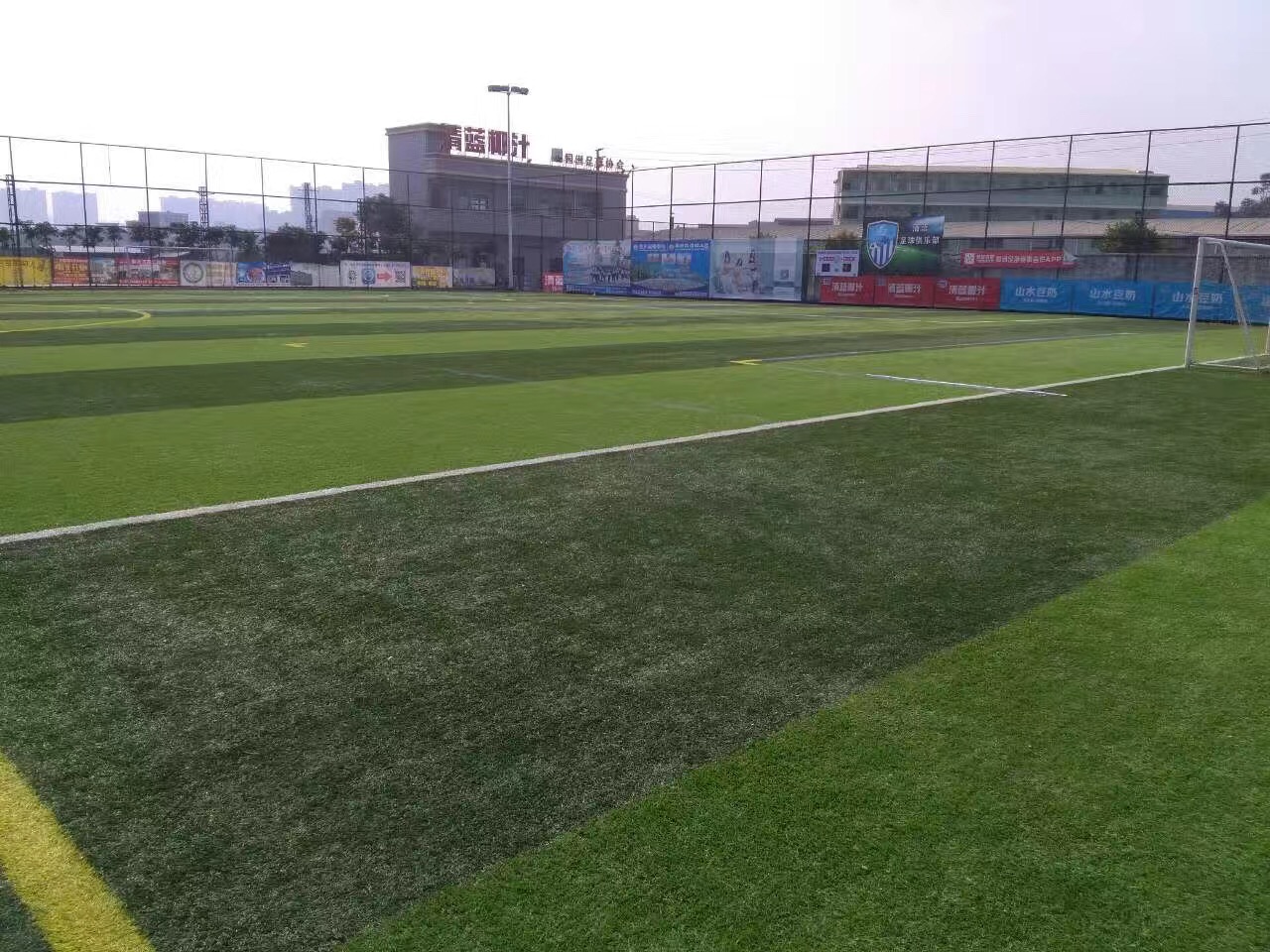 廣東省惠州市博羅縣某協(xié)會(huì)足球場(chǎng),是一個(gè)在11人制足球場(chǎng)上面又做了一個(gè)2個(gè)5人制的足球場(chǎng),這個(gè)協(xié)會(huì)場(chǎng)地的11人制足球場(chǎng)選擇的是用白色的足球草來(lái)規(guī)劃的線條,5人制選擇的是黃色的足球草來(lái)規(guī)劃的線條。